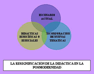 La resignificación de la Didáctica en tiempos posmodernos estaría involucrada, entonces, en tres dimensiones: incorporación de nuevas temáticas, escenario actual y las aportaciones de las Didácticas Especiales (Específicas).